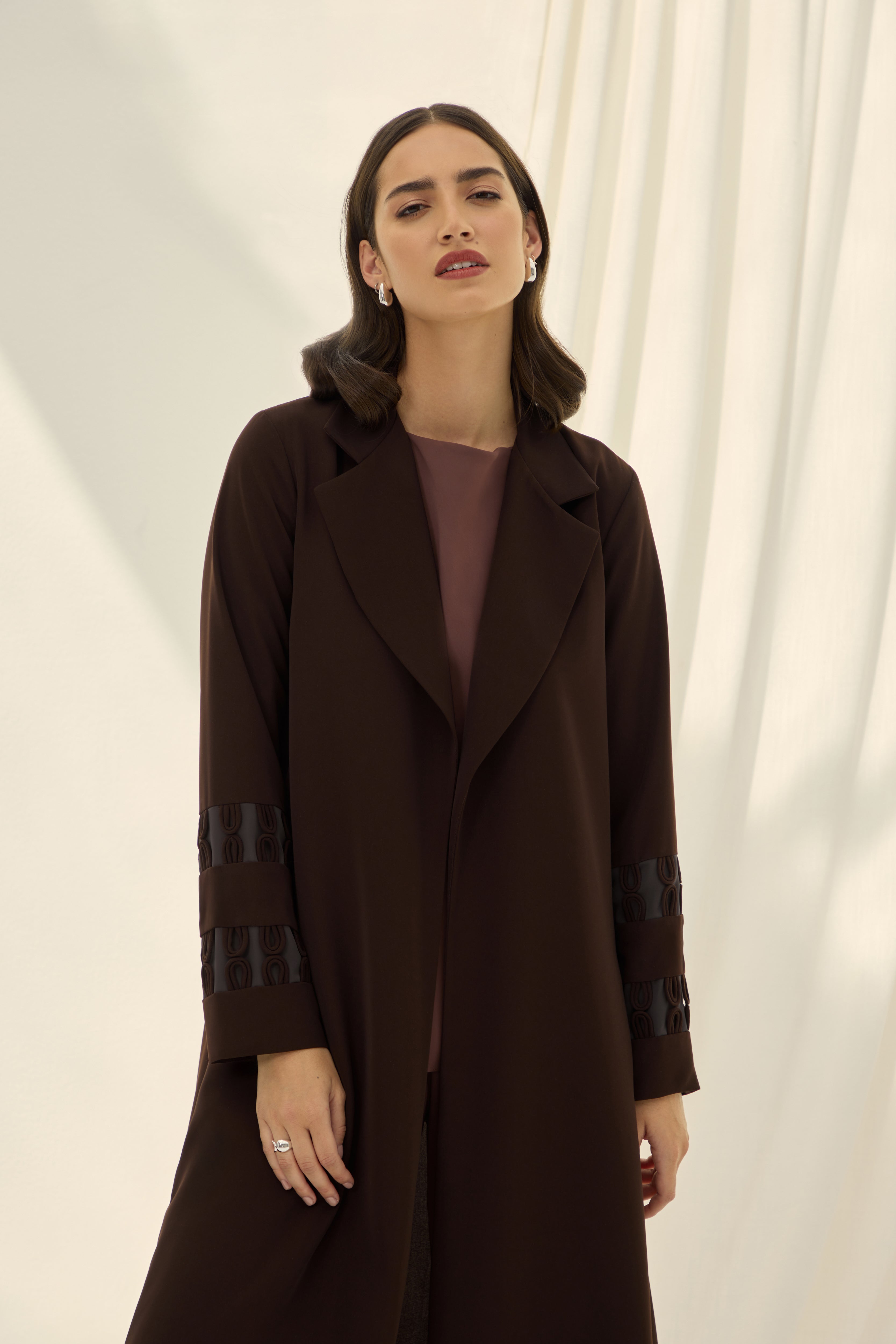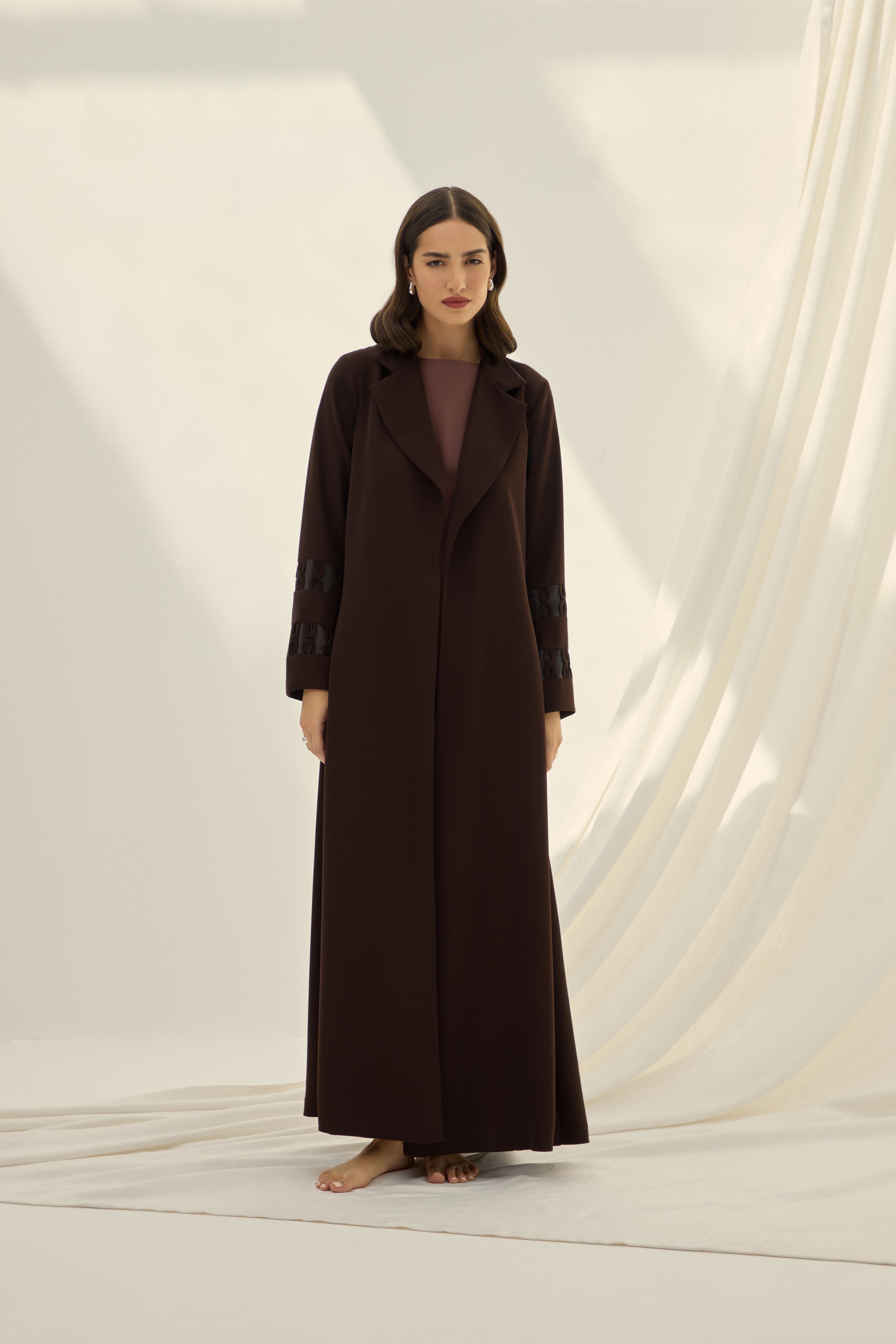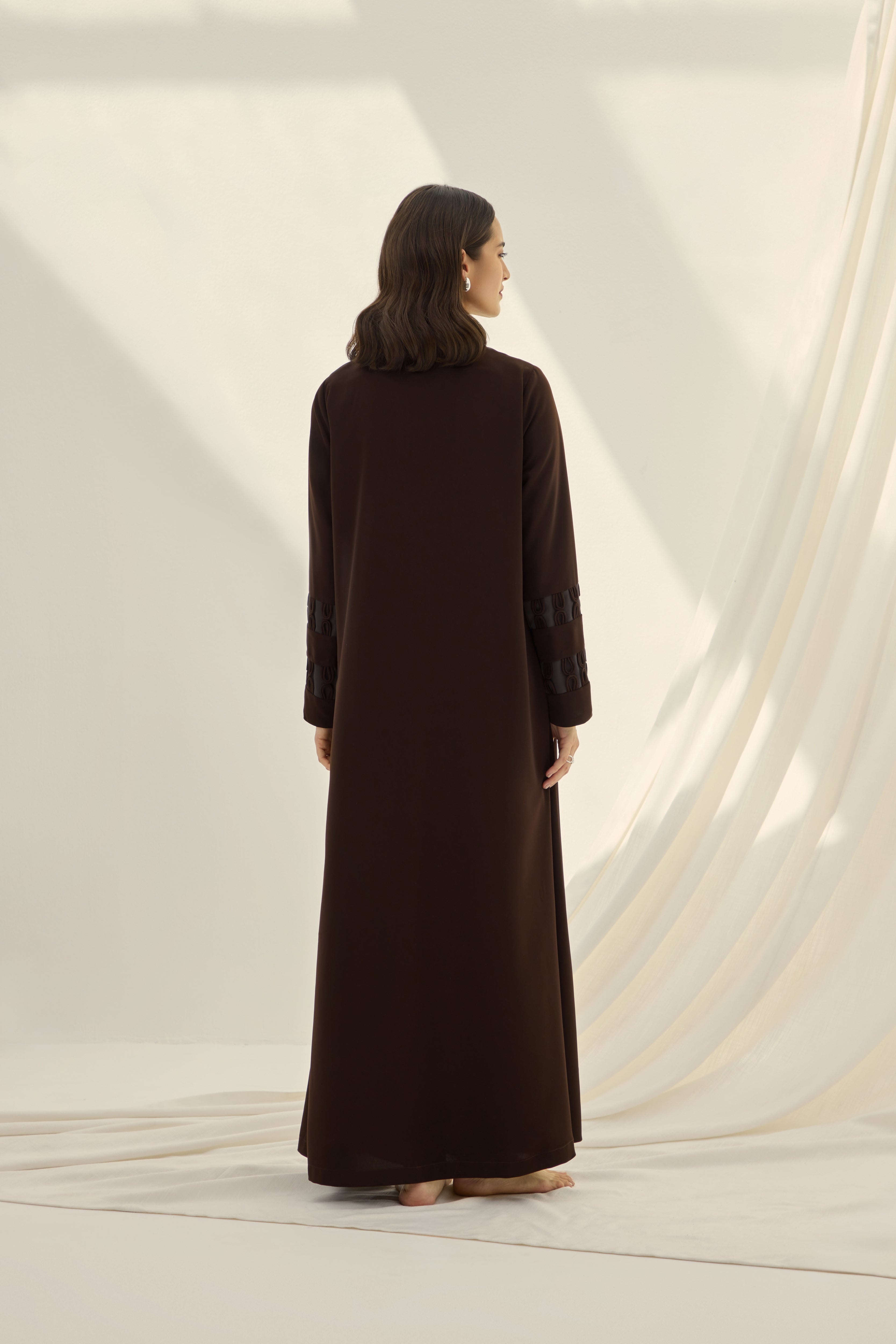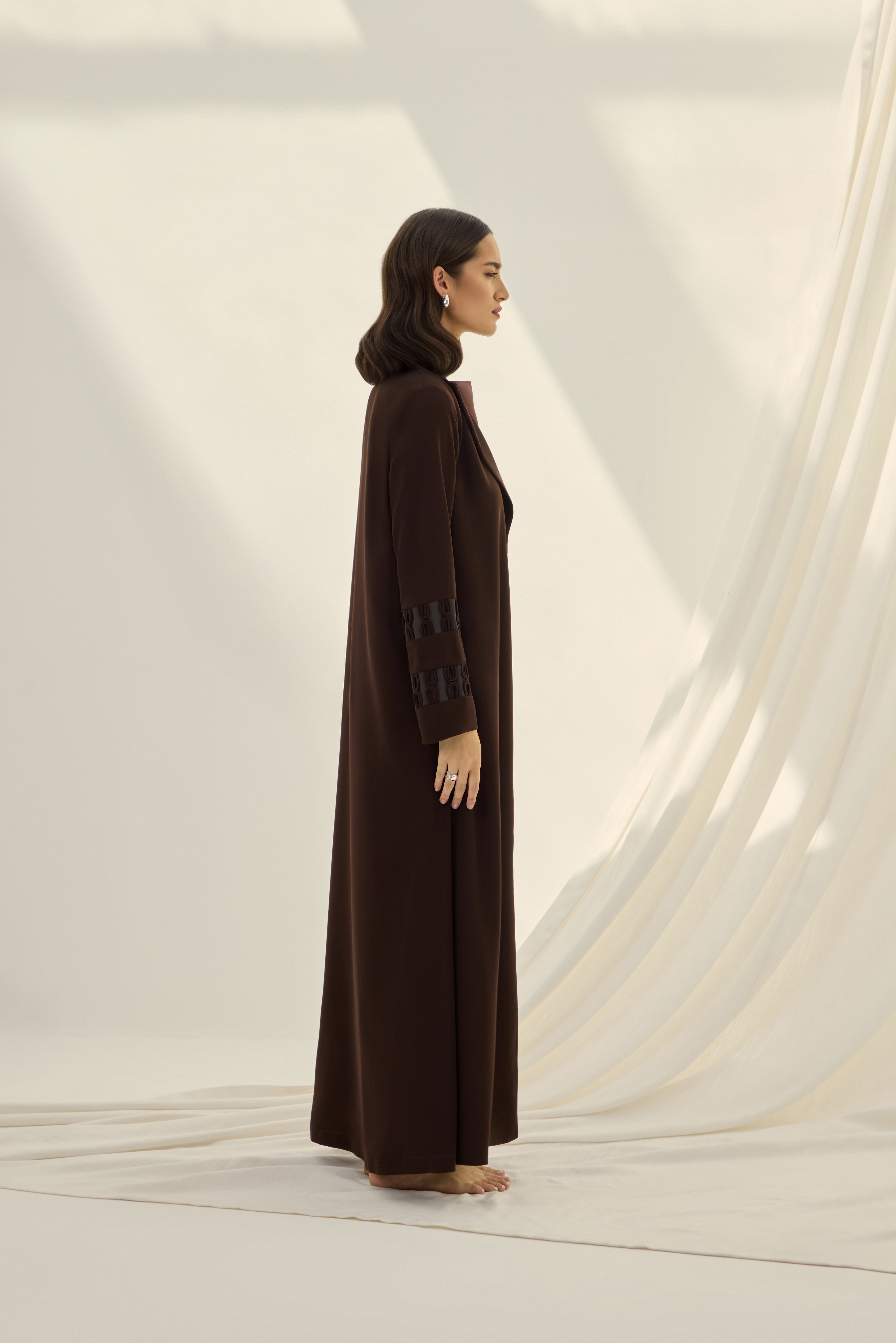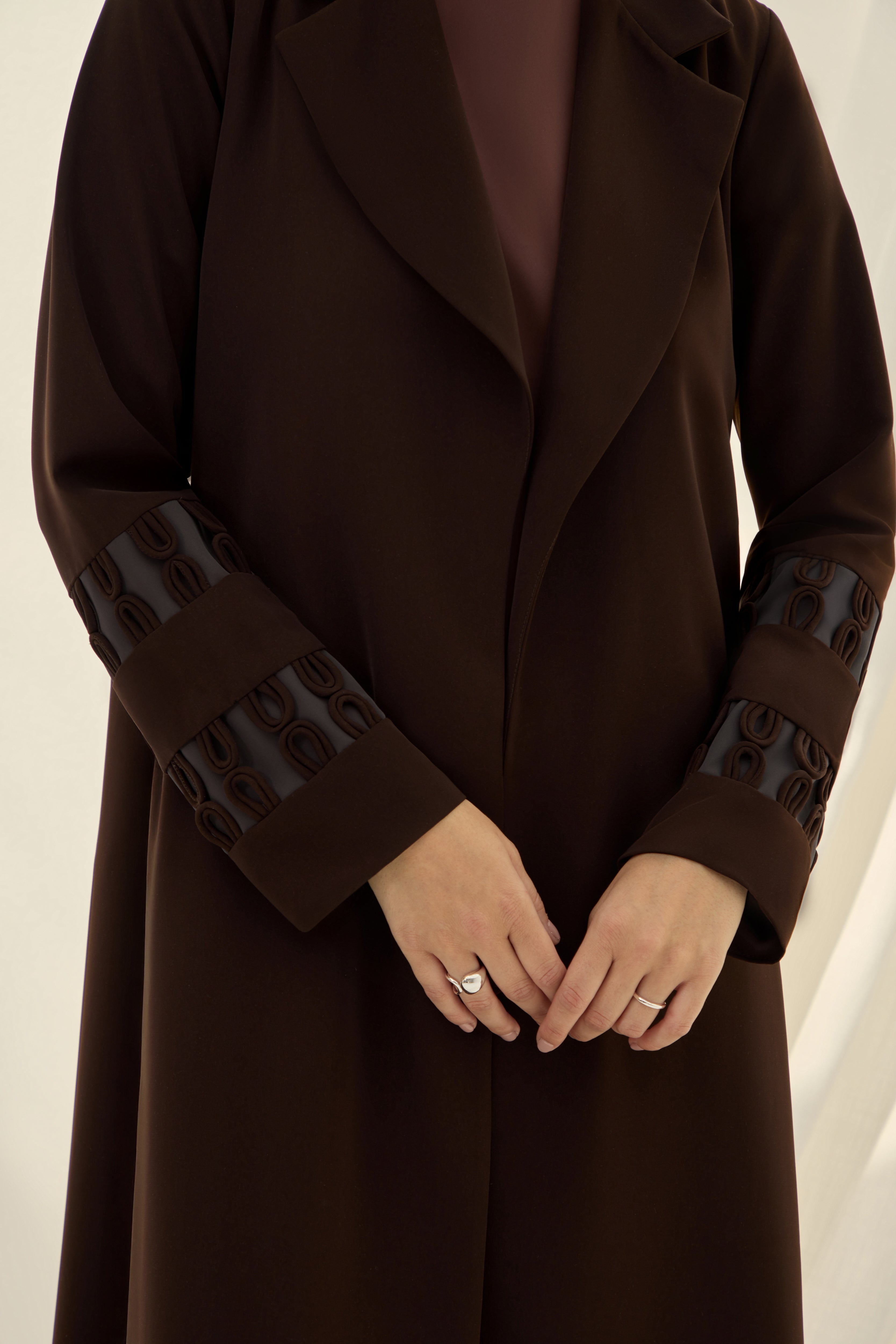 Collar-style brown abaya featuring artisanal knot work on the sleeves — a bold take on classic elegance.