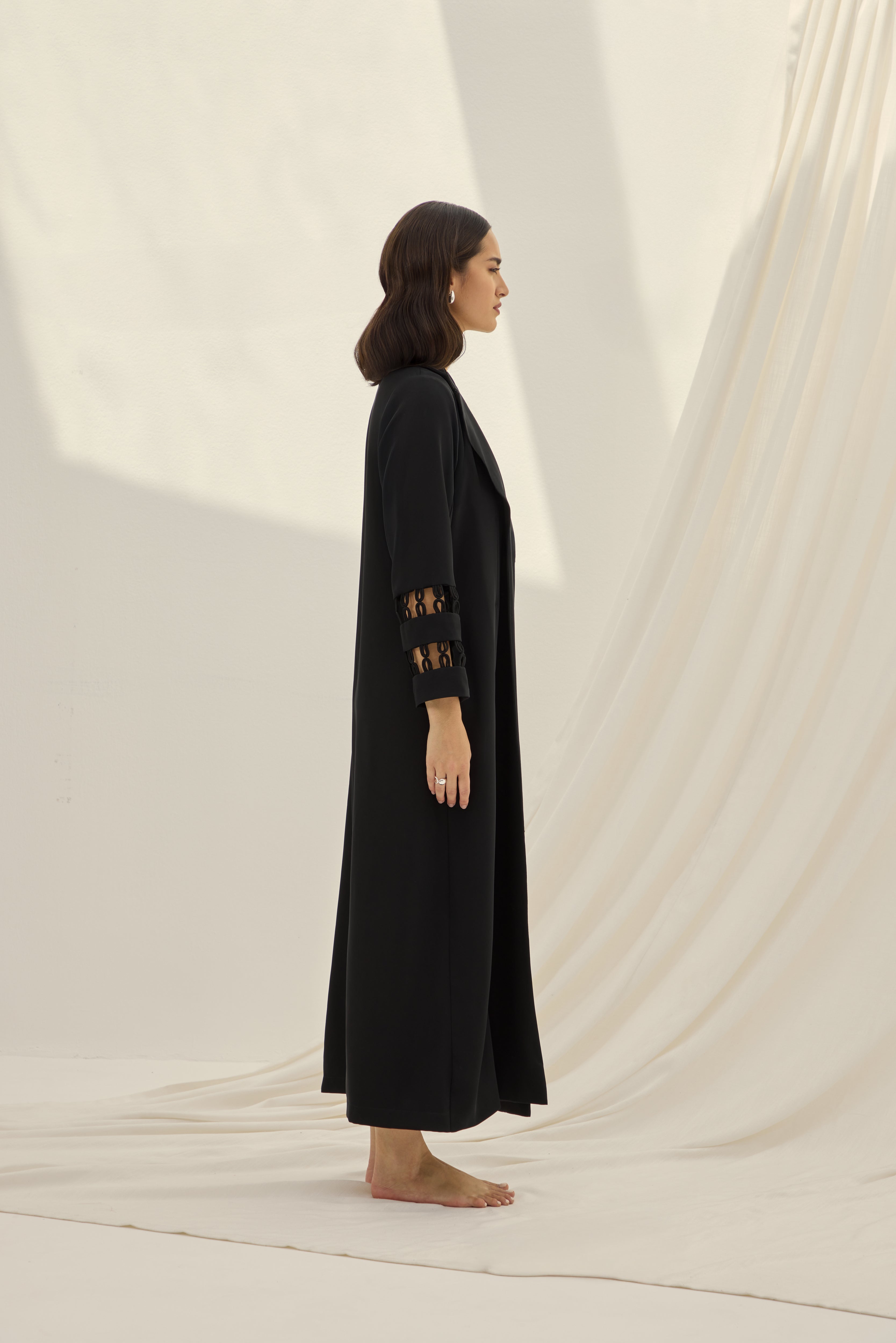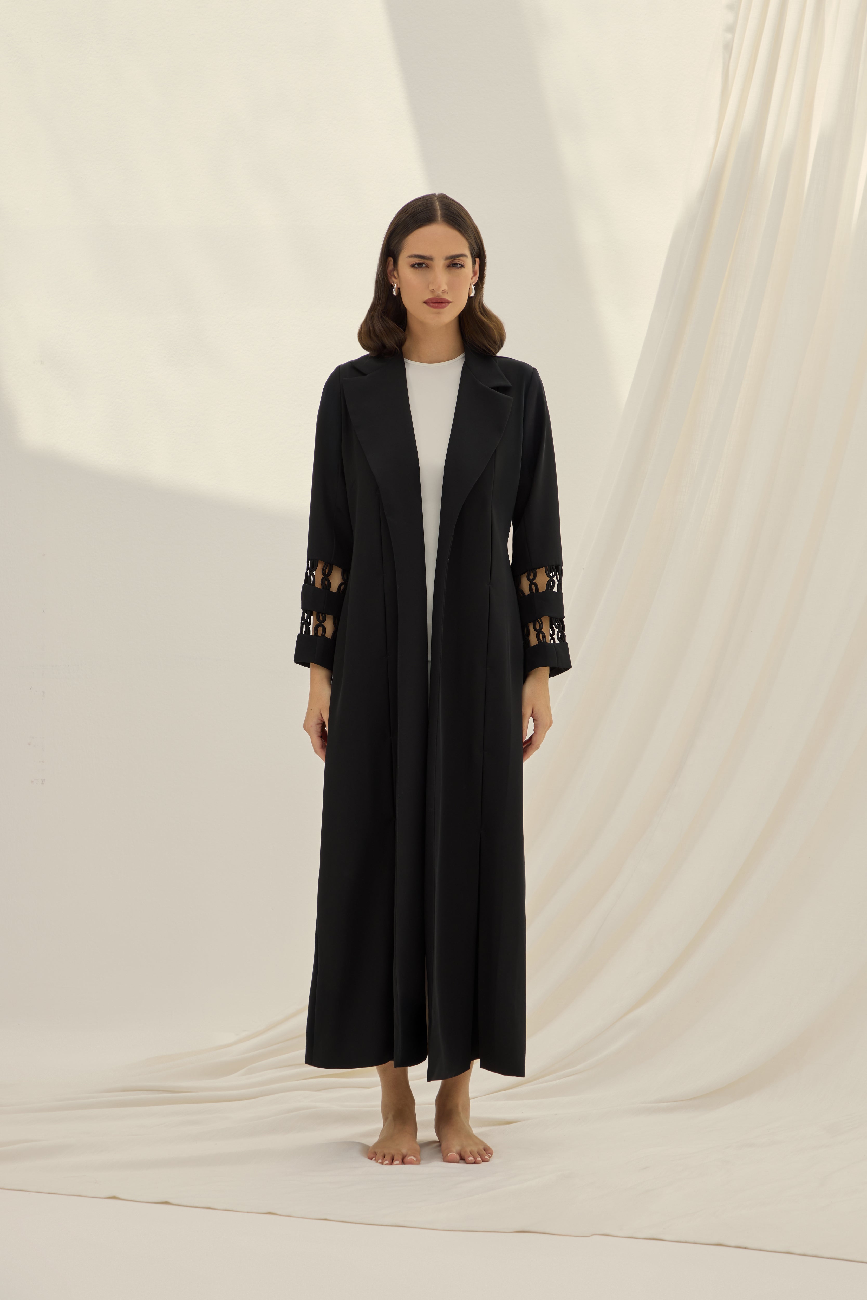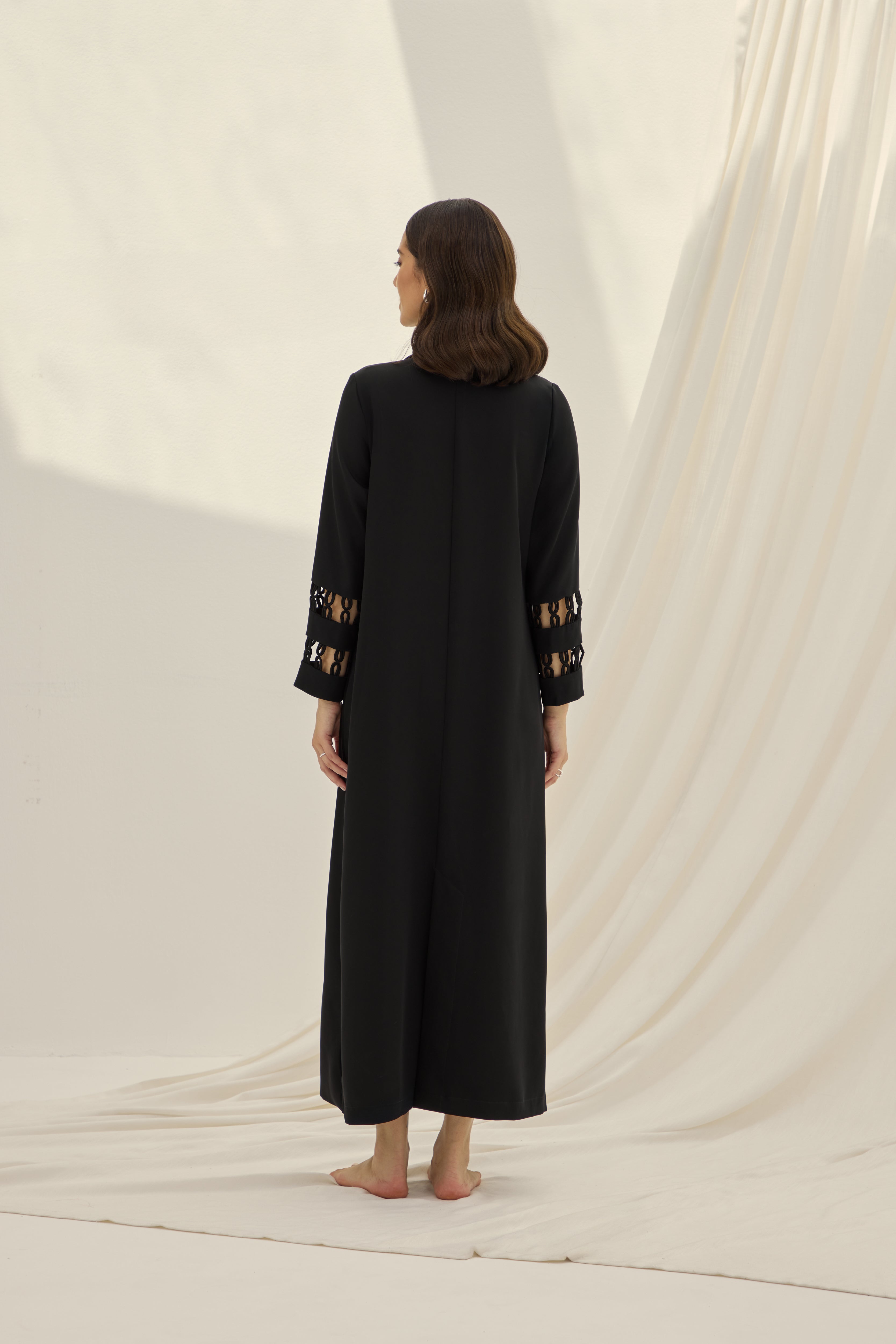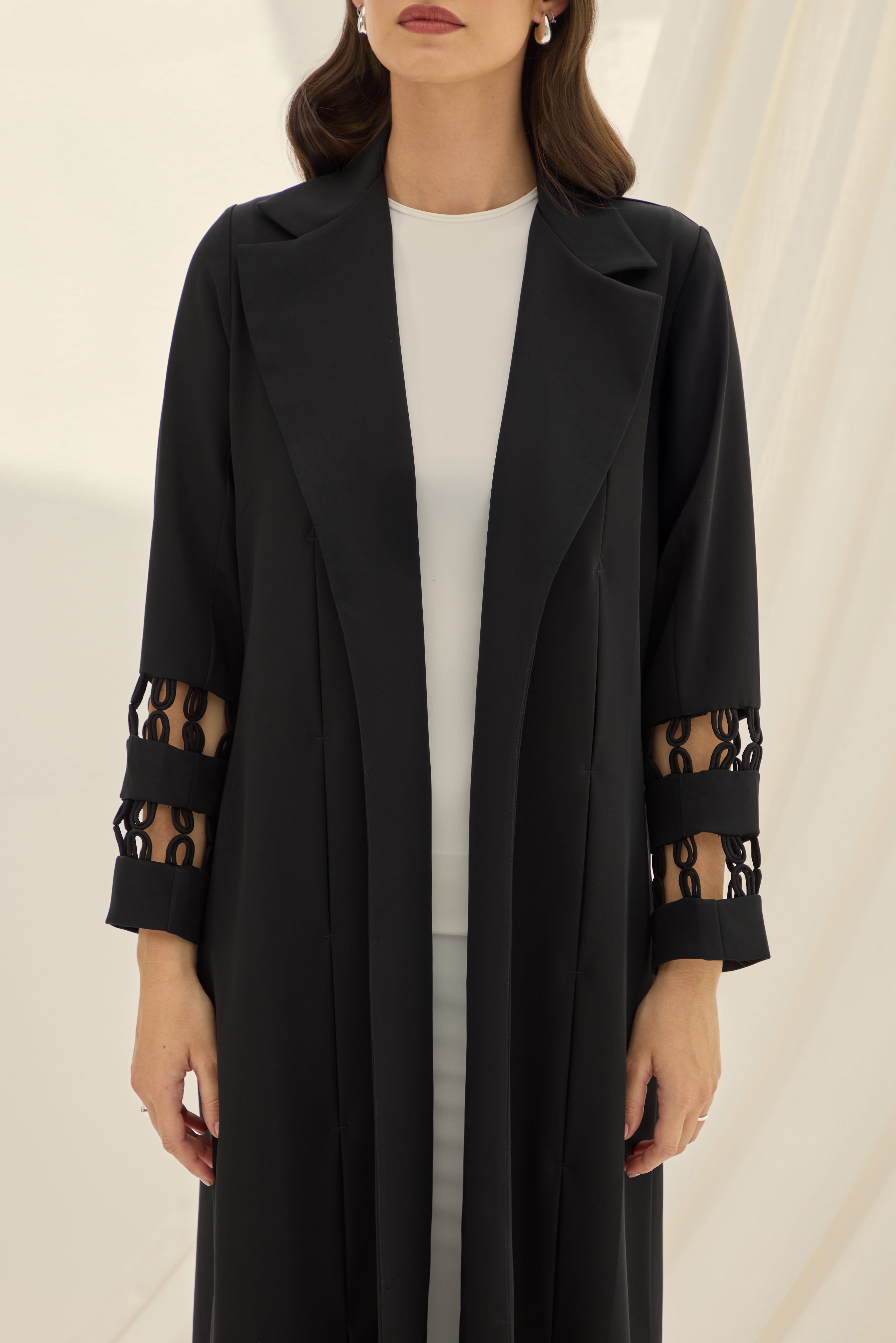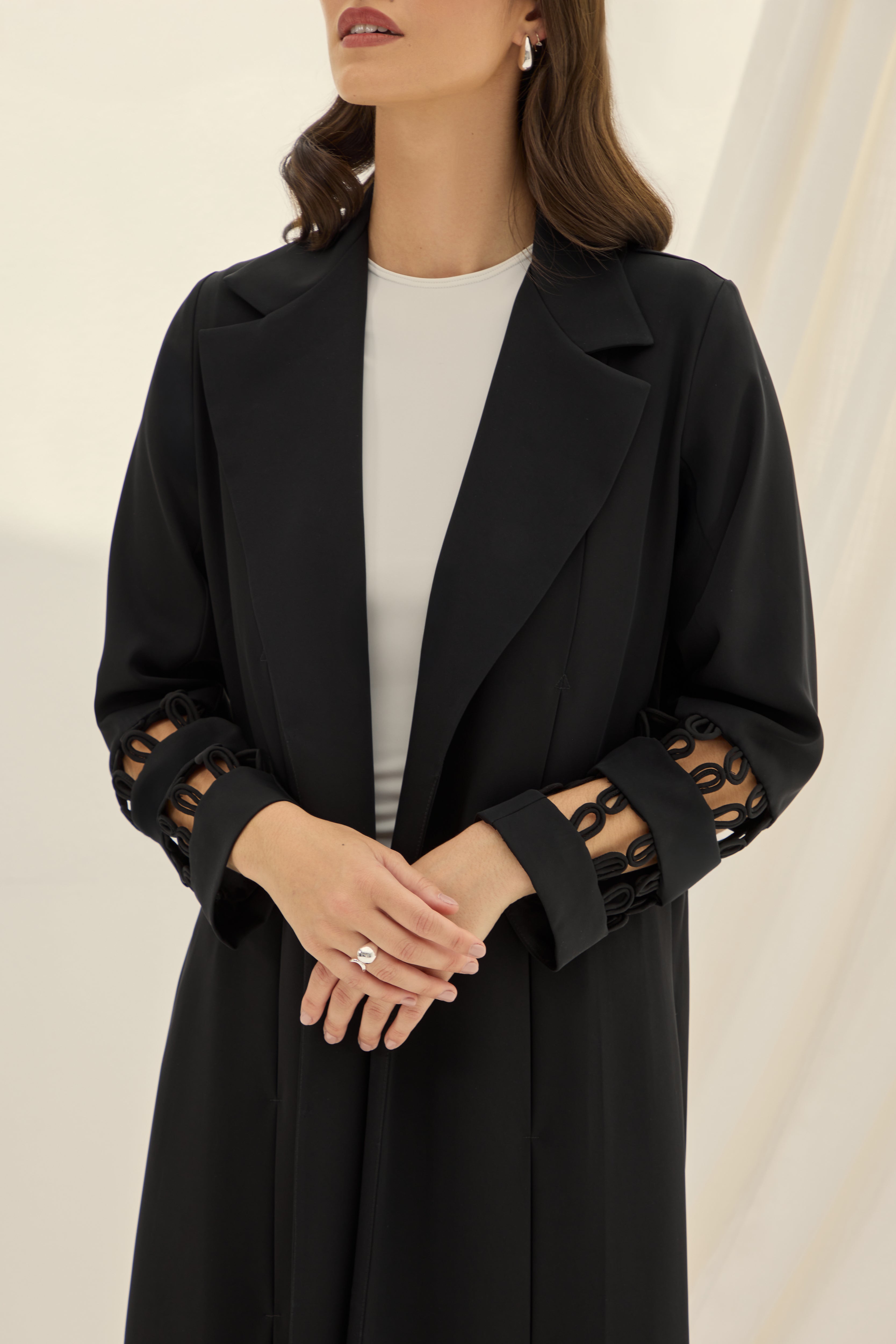 Collar-style black abaya featuring artisanal knot work on the sleeves — a bold take on classic elegance.